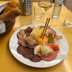 The message from the girl delivering the Brettljause was, “If you need more bread, ask – I just don’t want it to get stale.” The first thought I had was, like, who do I need two slices of bread for such a tiny Jause? Really, even the wooden board was about half of the standard size. Not that I was especially hungry, having had a breakfast at the hotel only two hours earlier and already planning a second Brettljause later in the day. But truth be told, it was indeed an unusually small Brettljause, the kind that better be extremely good if it wanted to stand up to competition.