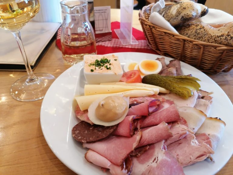 Fortunately, it turned out that a small table was available, and within a couple of minutes I had a glass of wine in front of me and was awaiting the Heuriger’s special “Gewölbeplatte,” happy that my two-and-a-half-hour walk along boring asphalt roads was not for nothing, after all.