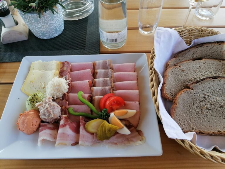Eaten: | “Winzerteller,“ ¾ mineral water (Gasteiner), ¼ Weissburgunder Klassik, 1/8 Gelber Muskateller, 1/8 Ried Rettenberg Schilcher, 1/8 Ried Rettenberg Sauvignon Blanc 2018 |