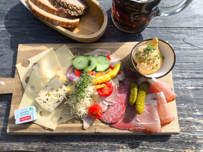 Despite the name, the “bread time” of Jenneralm seriously lacked bread. The four smallish slices provided were barely sufficient for the cheeses, forcing me to spread the cheese as thickly as possible. Nevertheless, apart from that and the oversalted Speck, my very first German Brettljause left a favorable impression.