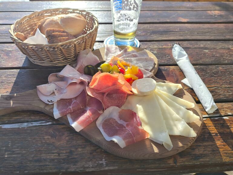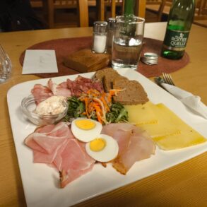Therefore, I took a train to Brenner (Brennero) and then another one to Sterzing (Vipiteno) on the South Tyrolean side to do some tobogganing (at the Italy’s longest track), walking in the snow, and having good food and coffee. What a difference! Vipiteno (I don’t dare calling it by its German name), though size-wise comparable to Steinach (my base in Austria), has a charm of an Italian holiday village, while Steinach is depressingly industrial. Sterzingerhaus, located relatively close to Rosskopf’s (local mountain) top cable car station, serves both a traditional South Tyrolean Marende (with three ingredients) and a “Gemischter Aufschnitt” platter, which is a nod towards Austrian Brettljause. As much as I respect Marende, the choice was easy to me.