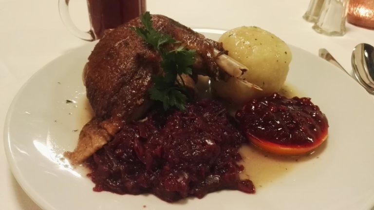 The goose tasted quite OK at first, disregarding the totally non-crispy skin. The closer I got to the bones, however, the more difficult it became to cut the meat or even to separate the meat from the stuff that was, well, not meat. I am sure the cook could give a very good explanation for that phenomenon, but to me, under-cooking appears to be the most likely reason. It did not help that sauce was almost non-existent (the meat was not too dry to really require one, though), the cabbage was industrial and a bit too sour for my liking, and the potato dumpling was tasteless and “spongy.”