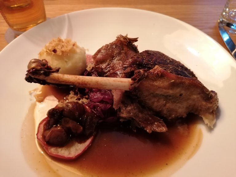 While most restaurants these days – for the reasons I can only speculate on – serve goose legs, the Herkner decided to be fairer and delivered the leg with a small piece of a goose’s breast. Obviously, the breast came from a different goose, though, for it was quite juicy and fat and was eaten in about two seconds. The leg, on the other hand, was quite meaty but terribly dry and devoid of salt. I am rather used to dry meatless geese, but this was quite a new experience – biting into a thick chunk of meat and then spending a minute chewing it, while taking small sips of beer just to moisten the bland meat.