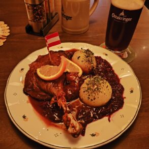If I had to compare, the closest thing in terms of texture of Klein Steiermark’s goose is pulled pork. Actually, the slightly smoky flavor that the goose had is another similarity. But don’t get me wrong, it is still a goose, cooked with much love and expertise. It is served with a fantastic honey-spiced sauce, a functional Knödel (its only function being to absorb the sauce) and two types of cabbage: the traditional red one and a white one with bits of Speck in it. The amount of cabbage is smaller than in other places, which is completely fine with me, as I am often struggling to finish it. An apple with lingonberries is provided too, as well as a sprig of rosemary, probably as a tribute to the restaurant’s grilling origins.