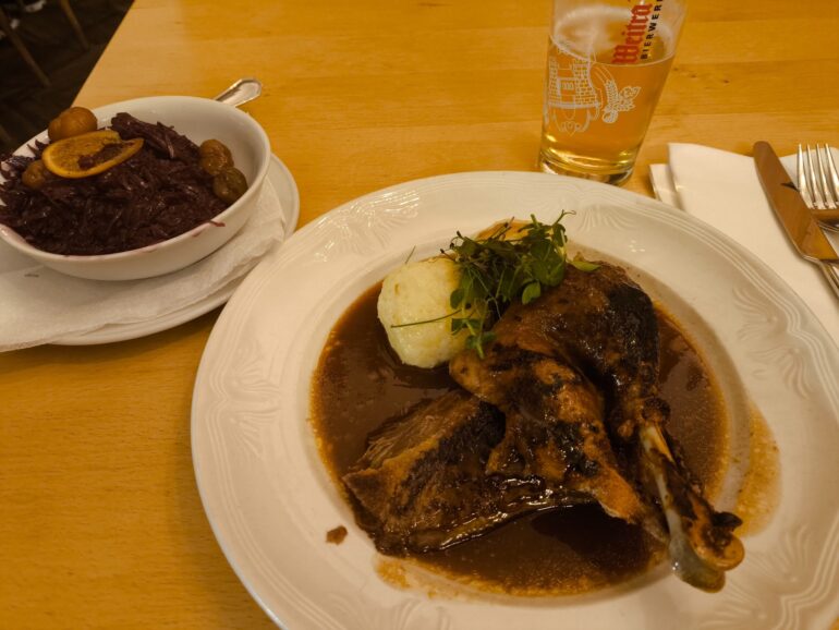 If you are looking for a quality goose, however, Winklers will not disappoint. My bird was perfectly cooked: crispy outside, tender inside, just salty enough. Plenty of tasty jus ensured that the meat never turned dry, and though there were a few parts where the skin basically touched the bone – so there was no meat to speak of – I found those bits most enjoyable. The dumpling was, unfortunately, very plain, but with a lot of jus available, it had some use. The best part of the red cabbage was the chestnuts it was mixed with, for the cabbage itself did not taste special. It was extremely hot, however: the first time I put a spoonful of it in my mouth, I was not sure what to do, for swallowing it appeared too dangerous, while spitting it out would have been too impolite (eventually I cooled it down with beer).