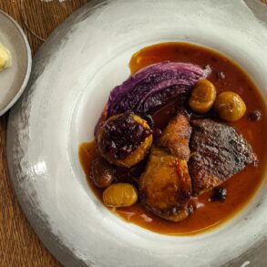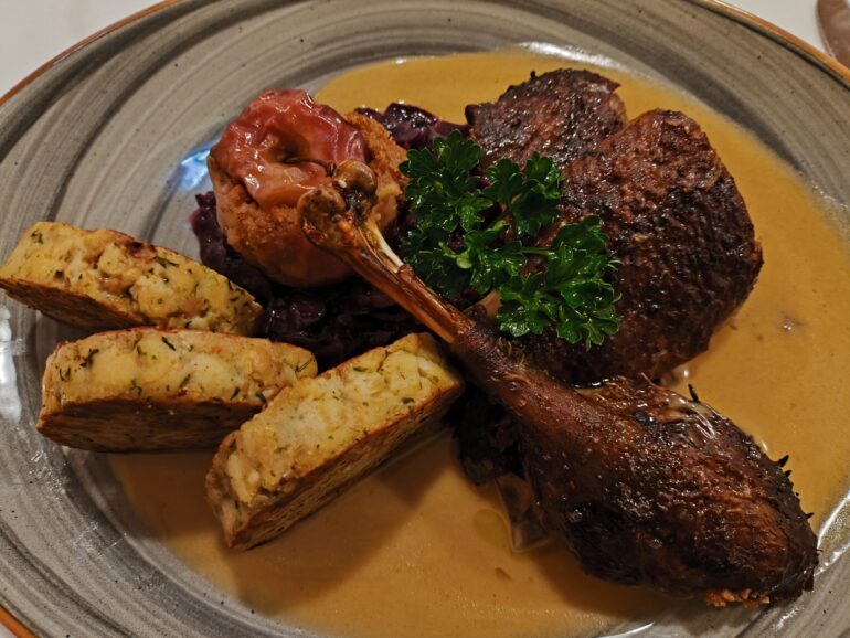I liked the bread dumplings, which were well spiced. The red cabbage may have been slightly overcooked, but had a pleasant sweet taste with a subtle Christmas-y flavor of cinnamon. The only problem was, during the cooking a piece of a cinnamon stick must have fallen on the goose itself and got attached to its skin. Of course, I had the “luck” of accidentally biting on it, and it was not at all a pleasant experience. The first impression was like chewing a small piece of bark; the second impression was an intense taste of something weird, which made me think of some particularly disgusting medicine.