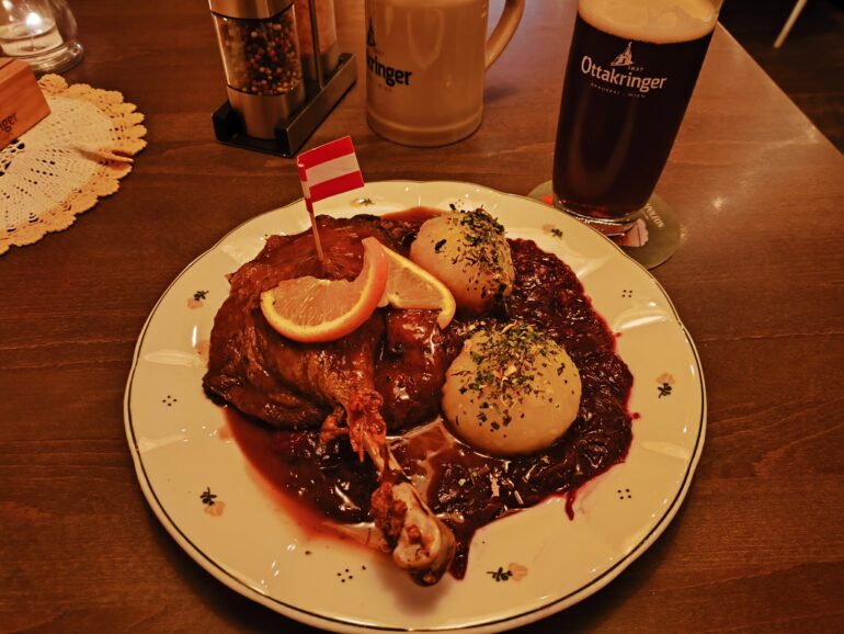 The super-duper happy goose from Linz-land, while not at all bad, was exceedingly normal. It had a tender, easy-to-chew meat with no fat, which was easily detachable from the bones and “extractable” until the end. On the other hand, the goose leg had no crispy skin whatsoever and seriously lacked salt. The red cabbage was OK, but since it was provided on the same plate as the goose, very soon I had to worry about not mixing it with the bones, which – as you can imagine – is not something one wants to worry about while enjoying a once-a-year specialty. The potato dumplings were, to be honest, plain to the point of unpleasantness, and the cook’s “bright” idea of putting some industrial dry spices over them made the entire dish smell like something recently taken out of an old cellar.