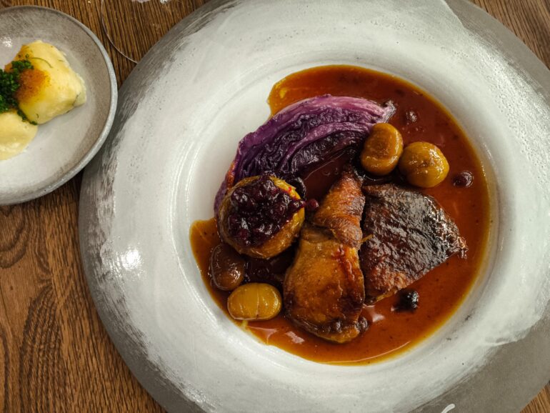 But please don’t go there if your goal is to eat a traditional Martinigansl. You will get two smallish slices of meat in a sauce, a few chestnuts, an apple with cranberry jam in it, and a separate plate with some of the tiniest dumplings you have ever seen. To shock you, you will also get an uncut red cabbage. Mind you, you are going to enjoy all of that anyway (because of the 39 euros price tag, at least), but leaving the Weinbank, you cannot – and should not – claim you have had a true Martinigansl.