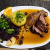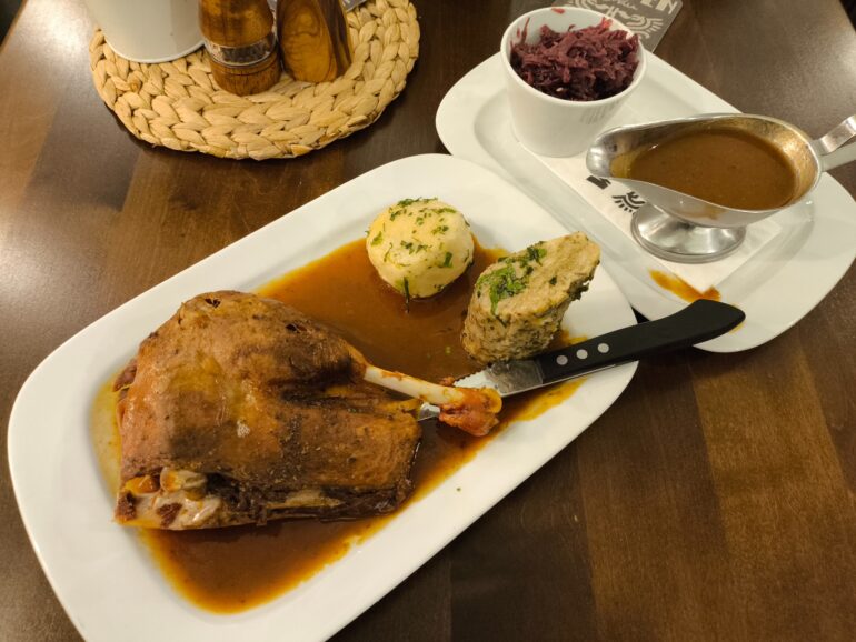 I’ve got rosemary instead. This year, the restaurant’s cooks have, unfortunately, decided to play safe and use a much more common spice. The rosemary was present in the red cabbage, adding a pleasant flavor to its already enjoyable, tangy taste. It was also heavily present in the bread dumpling, resulting in one of the tastiest dumplings I have ever tried. The same dumpling was also soaked in oil, which made it very unhealthy but amazingly good. The dumpling with some good sauce could have easily stood as a dish by itself, a great complement to beer. (By the way, unlike some dishonest fakes that put “Bräu” in their names, this restaurant is a real brewery, with quality, but not particularly interesting beers.) The second dumpling, made out of potatoes, was deadly plain, sadly.
