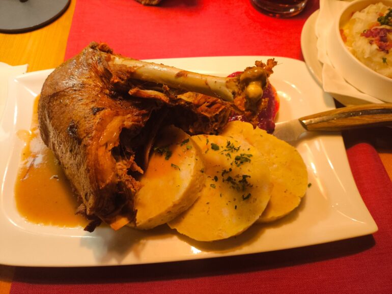 Unfortunately, the restaurant was for some reason determined to spoil the experience. The first mistake was serving the goose in a thick brown sauce that could have been OK for some game dishes (though I found its taste “aged,” to put it politely) but did not go well with goose meat. Unfortunately, as the goose was essentially swimming in the sauce, there was no way to avoid it. The white cabbage salad had an untypically high level of acidity, to the point that a few forkfuls of it caused me to cough. The salad included tiny bacon cubes, which were overcooked and therefore hard and salty, with the taste resembling smoked fish. The bread dumplings lacked any flavor, as did the sad dry herbs they were speckled with.