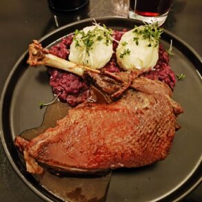 The fact remains, however, that Zum Straba serves a well-cooked goose at a very fair price (which explains the restaurant’s popularity among Viennese pensioners). It may be hard to believe by looking at the photo, but the bird’s skin was consistently crispy, which is usually achieved by continuously pouring fat and oil over it while roasting. Beneath the skin, the meat remained very tender and fatless, and it was only once I reached the bones that the remaining meat became a nuisance to discover and detach. But by that time, the goose was completely cold, so there was no longing for cleaning the plate anyway. While the potato dumpling was totally boring, the red cabbage was a nice surprise: not only was it crunchy, but also had a slightly sour flavor, which I prefer to the more common sweet Christmas-y taste.